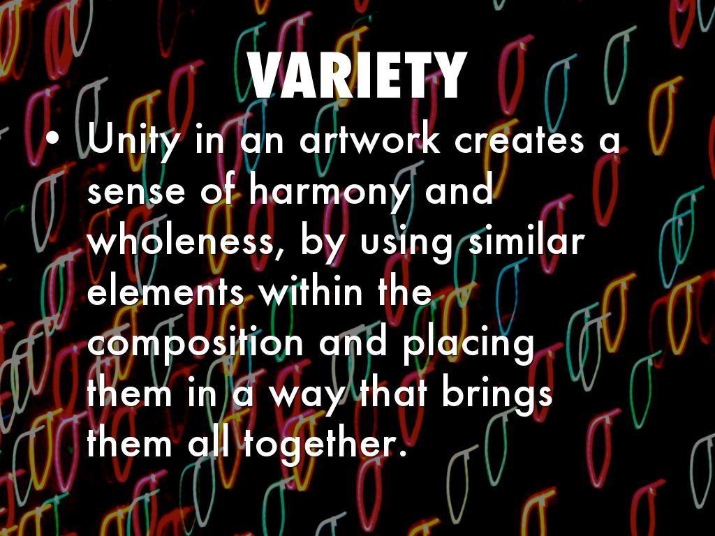 Unity in an artwork creates a sense of harmony and wholeness, by using similar elements within the composition and placing them in a way that brings them all together.