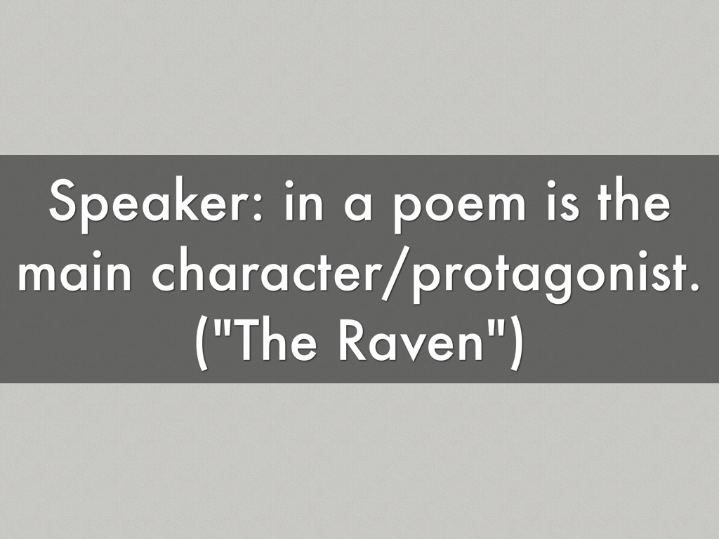 Speaker: in a poem is the main character/protagonist.("The Raven")