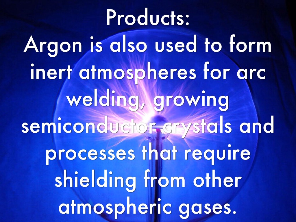 Argon is also used to form inert atmospheres for arc welding, growing semiconductor crystals and processes that require shielding from other atmospheric gases.