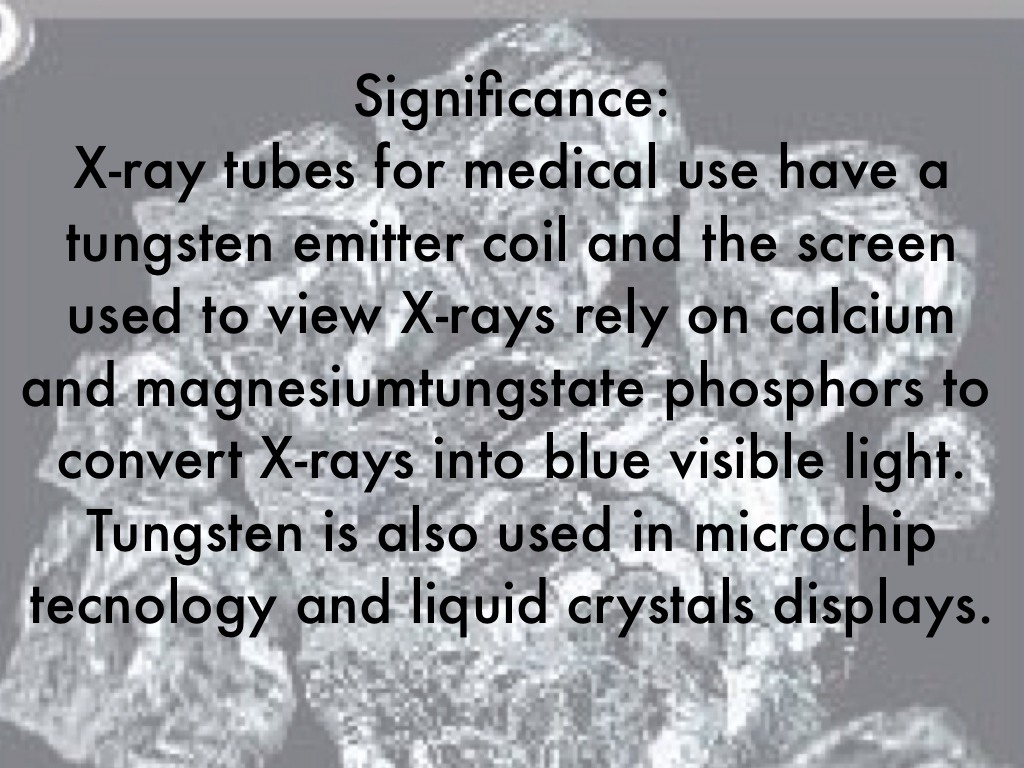 X-ray tubes for medical use have a tungsten emitter coil and the screen used to view X-rays rely on calcium and magnesiumtungstate phosphors to convert X-rays into blue visible light. Tungsten is also used in microchip tecnology and liquid crystals displays.