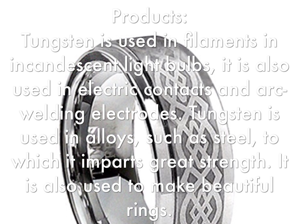 Tungsten is used in filaments in incandescent light bulbs, it is also used in electric contacts and arc-welding electrodes. Tungsten is used in alloys, such as steel, to which it imparts great strength. It is also used to make beautiful rings.