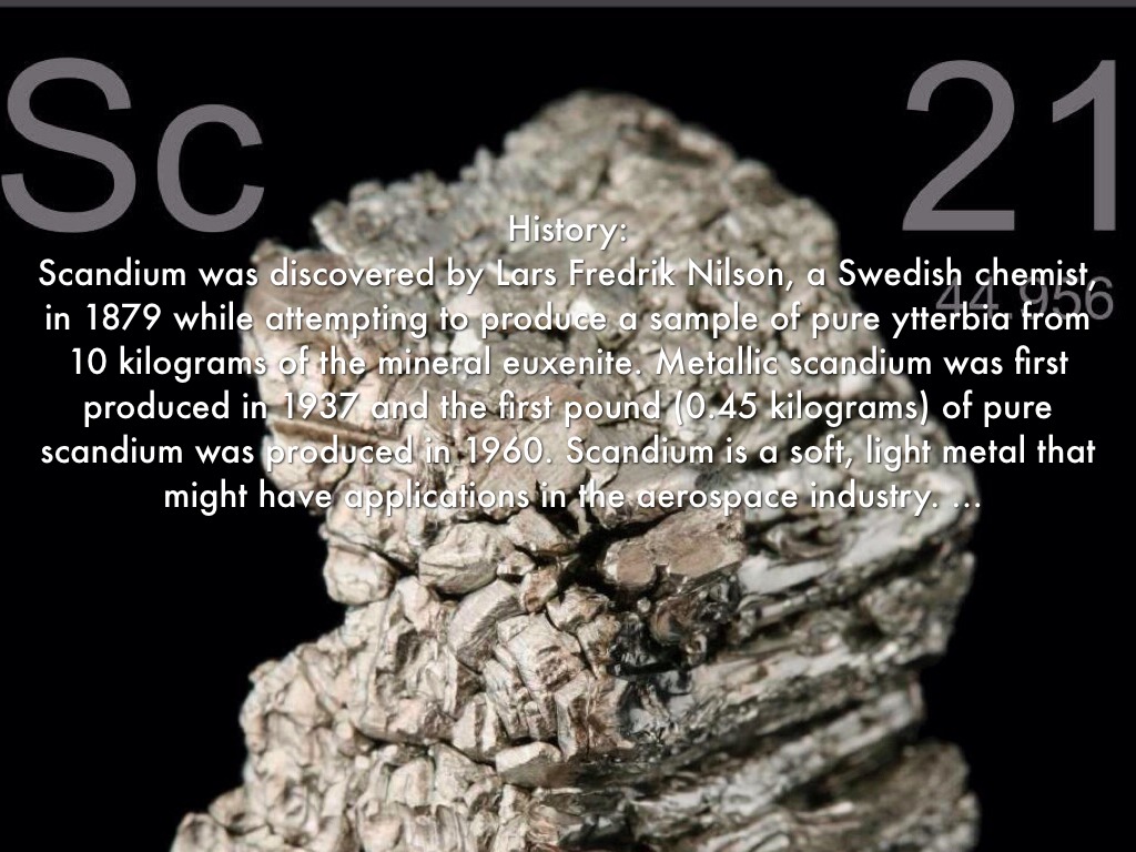 Scandium was discovered by Lars Fredrik Nilson, a Swedish chemist, in 1879 while attempting to produce a sample of pure ytterbia from 10 kilograms of the mineral euxenite. Metallic scandium was first produced in 1937 and the first pound (0.45 kilograms) of pure scandium was produced in 1960. Scandium is a soft, light metal that might have applications in the aerospace industry.