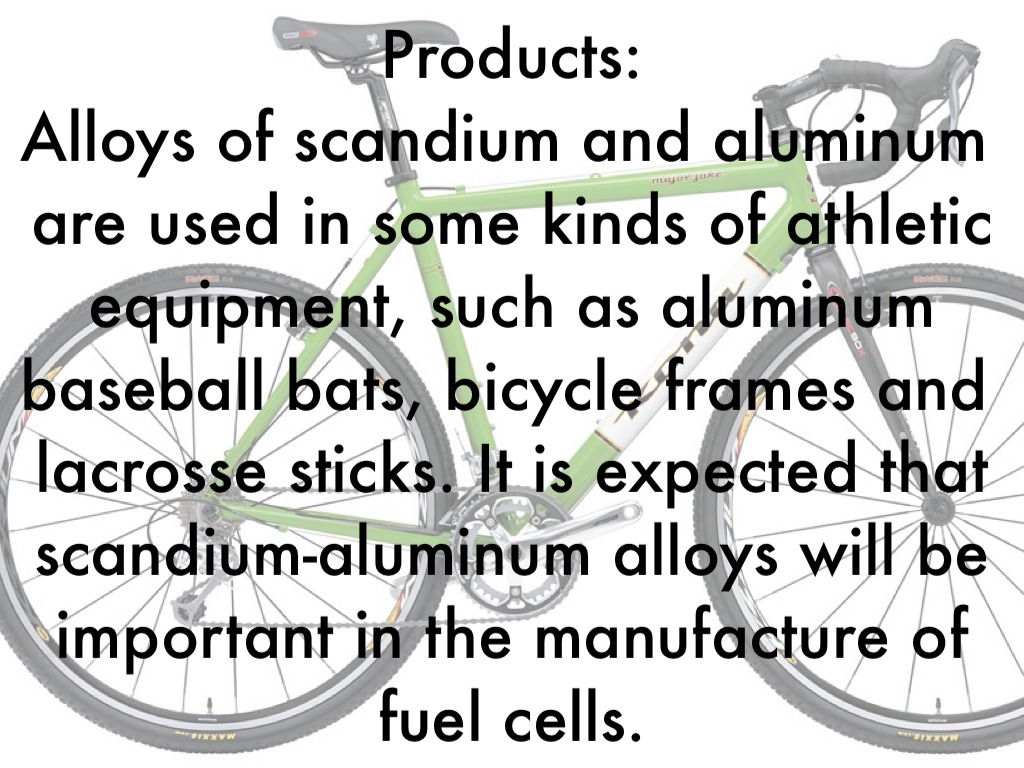 Alloys of scandium and aluminum are used in some kinds of athletic equipment, such as aluminum baseball bats, bicycle frames and lacrosse sticks. It is expected that scandium-aluminum alloys will be important in the manufacture of fuel cells.
