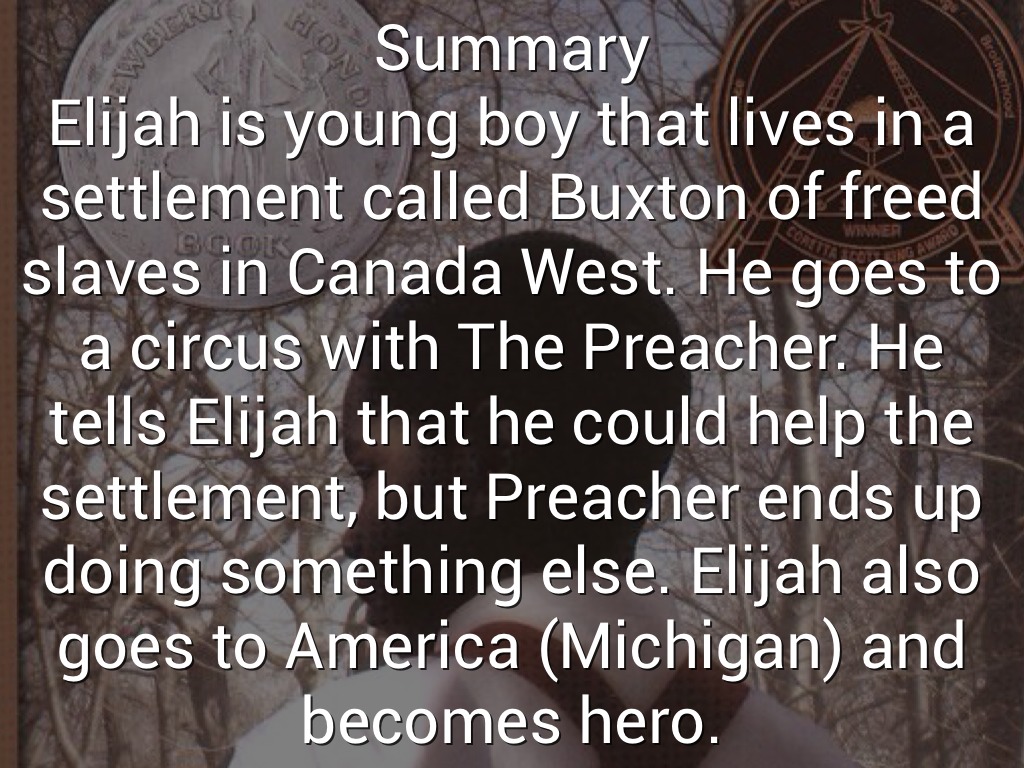 Elijah is young boy that lives in a settlement called Buxton of freed slaves in Canada West. He goes to a circus with The Preacher. He tells Elijah that he could help the settlement, but Preacher ends up doing something else. Elijah also goes to America (Michigan) and becomes hero.