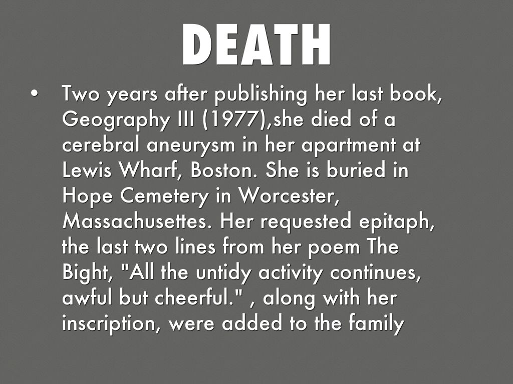 Two years after publishing her last book, Geography III (1977),she died of a cerebral aneurysm in her apartment at Lewis Wharf, Boston. She is buried in Hope Cemetery in Worcester, Massachusettes. Her requested epitaph, the last two lines from her poem The Bight, "All the untidy activity continues, awful but cheerful." , along with her inscription, were added to the family monument in 1997