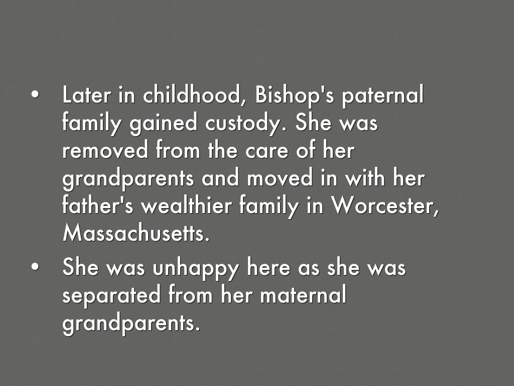 Later in childhood, Bishop's paternal family gained custody. She was removed from the care of her grandparents and moved in with her father's wealthier family in Worcester, Massachusetts.