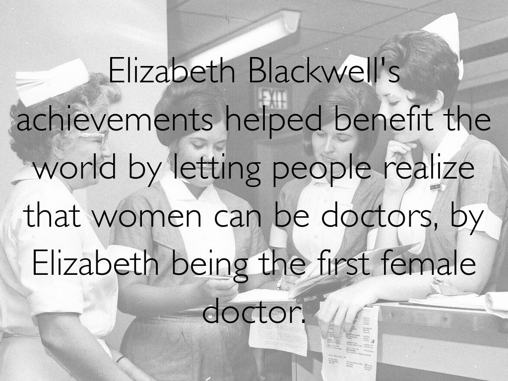 Elizabeth Blackwell's achievements helped benefit the world by letting people realize that women can be doctors, by Elizabeth being the first female doctor.