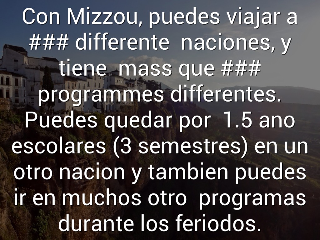 Con Mizzou, puedes viajar a ### differente naciones, y tiene mass que ### programmes differentes. Puedes quedar por 1.5 ano escolares (3 semestres) en un otro nacion y tambien puedes ir en muchos otro programas durante los feriodos.