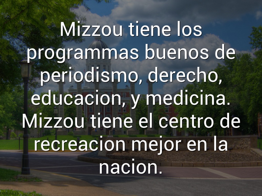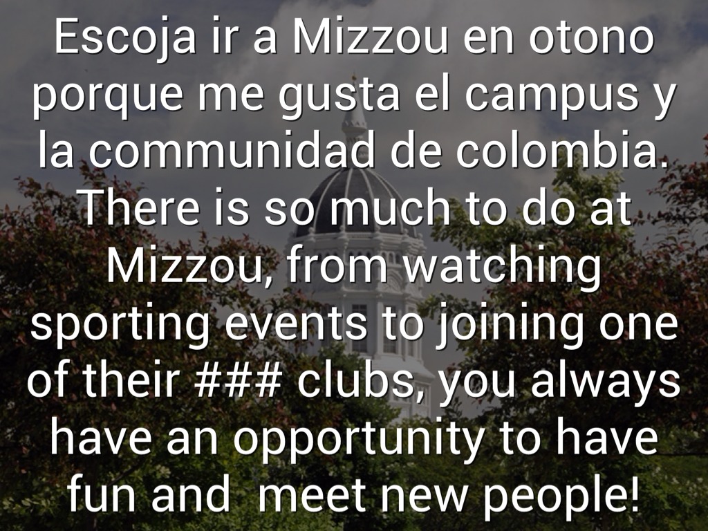 Escoja ir a Mizzou en otono porque me gusta el campus y la communidad de colombia. There is so much to do at Mizzou, from watching sporting events to joining one of their ### clubs, you always have an opportunity to have fun and meet new people!