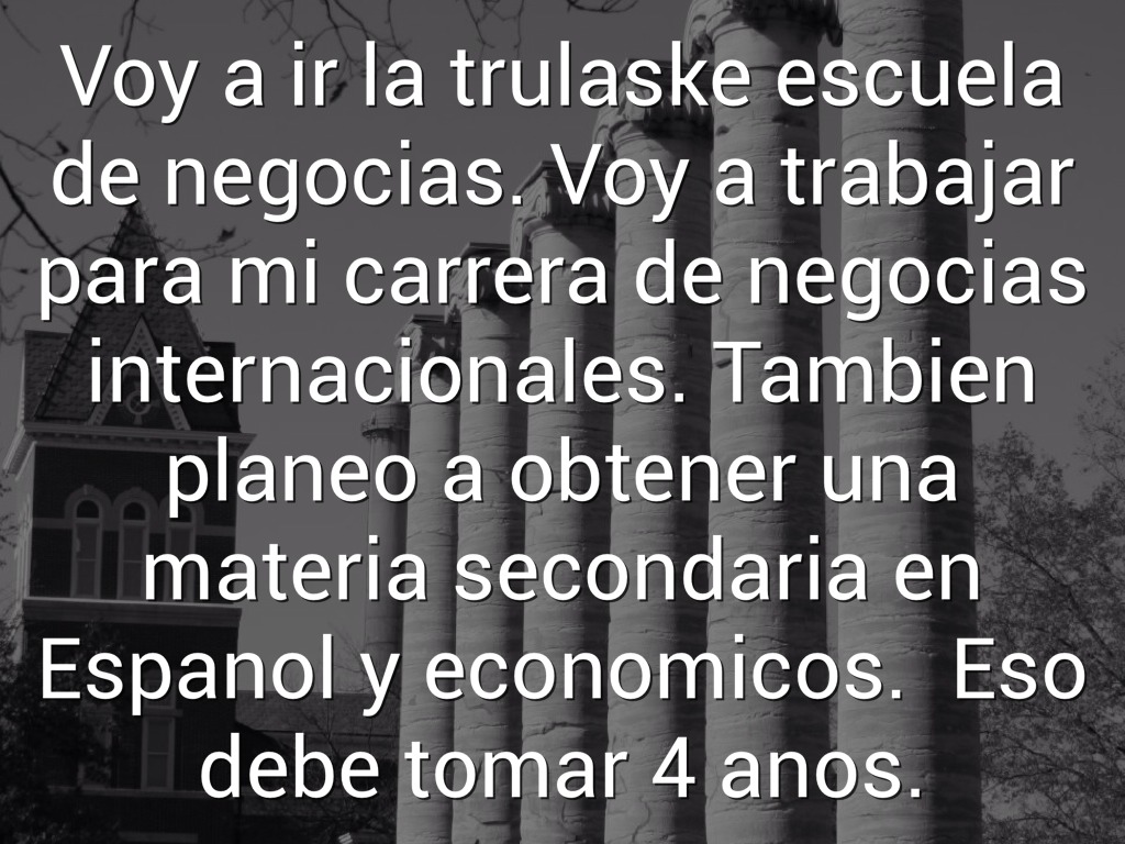 Voy a ir la trulaske escuela de negocias. Voy a trabajar para mi carrera de negocias internacionales. Tambien planeo a obtener una materia secondaria en Espanol y economicos. Eso debe tomar 4 anos.