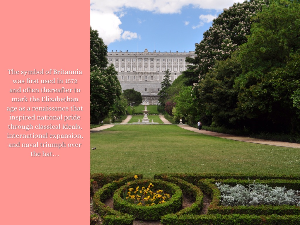 The symbol of Britannia was first used in 1572 and often thereafter to mark the Elizabethan age as a renaissance that inspired national pride through classical ideals, international expansion, and naval triumph over the hated Spanish foe.
