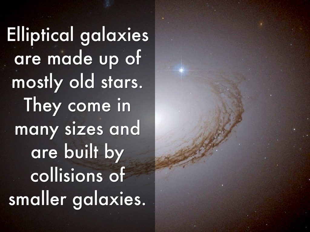 Elliptical galaxies are made up of mostly old stars. They come in many sizes and are built by collisions of smaller galaxies.