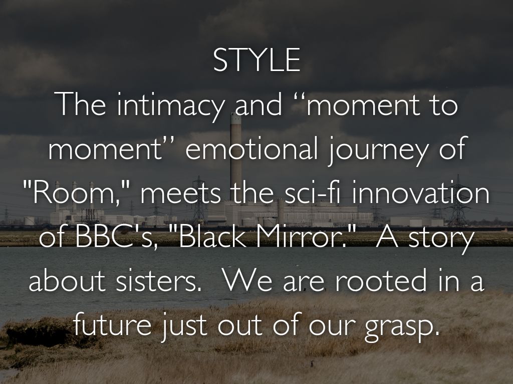 The intimacy and “moment to moment” emotional journey of "Room," meets the sci-fi innovation of BBC's, "Black Mirror." A story about sisters. We are rooted in a future just out of our grasp.