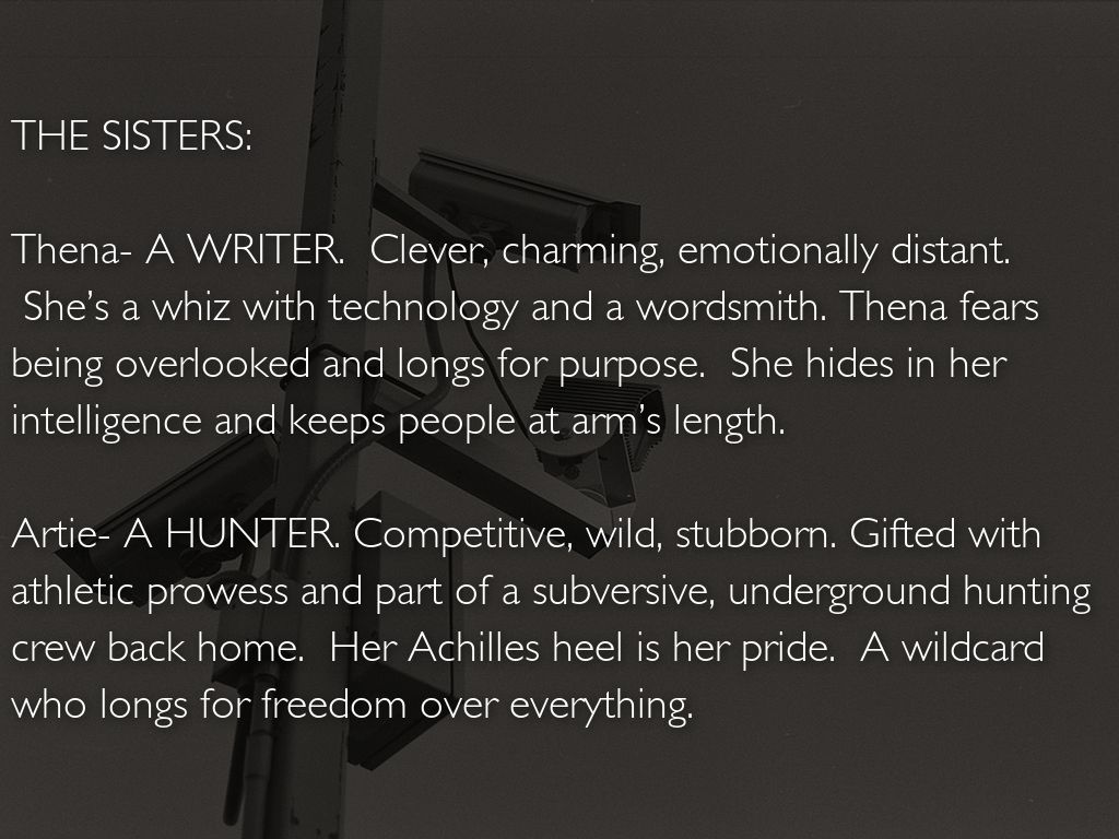 Artie- A HUNTER. Competitive, wild, stubborn. Gifted with athletic prowess and part of a subversive, underground hunting crew back home. Her Achilles heel is her pride. A wildcard who longs for freedom over everything.