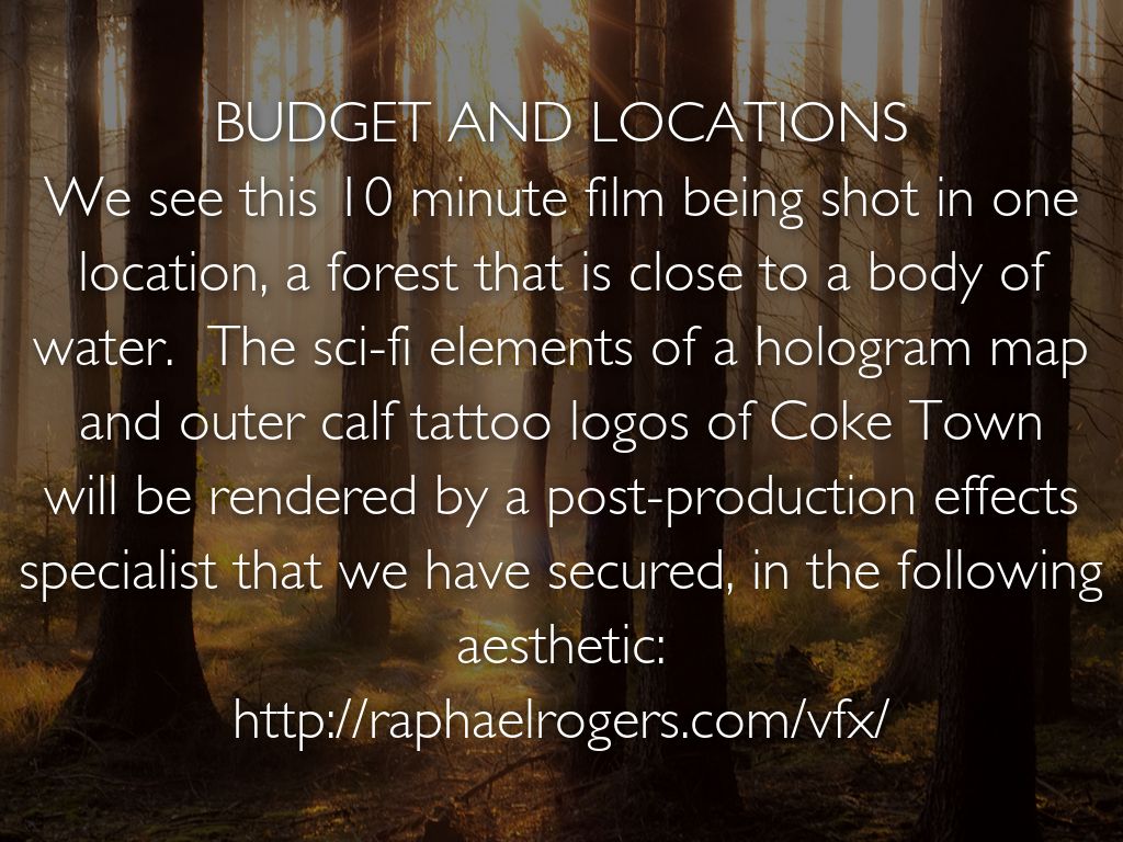 We see this 10 minute film being shot in one location, a forest that is close to a body of water. The sci-fi elements of a hologram map and outer calf tattoo logos of Coke Town
