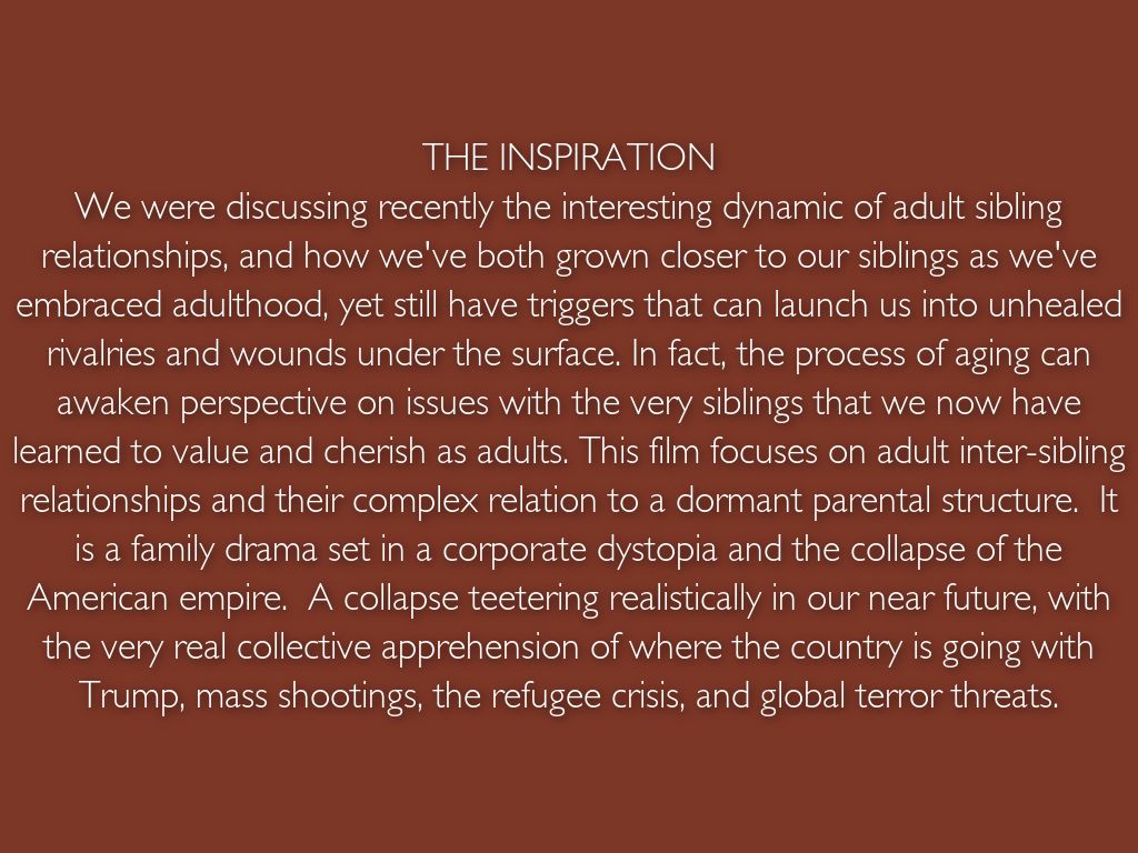 We were discussing recently the interesting dynamic of adult sibling relationships, and how we've both grown closer to our siblings as we've embraced adulthood, yet still have triggers that can launch us into unhealed rivalries and wounds under the surface. In fact, the process of aging can awaken perspective on issues with the very siblings that we now have learned to value and cherish as adults. This film focuses on adult inter-sibling relationships and their complex relation to a dormant parental structure. It is a family drama set in a corporate dystopia and the collapse of the American empire. A collapse teetering realistically in our near future, with the very real collective apprehension of where the country is going with Trump, mass shootings, the refugee crisis, and global terror threats.