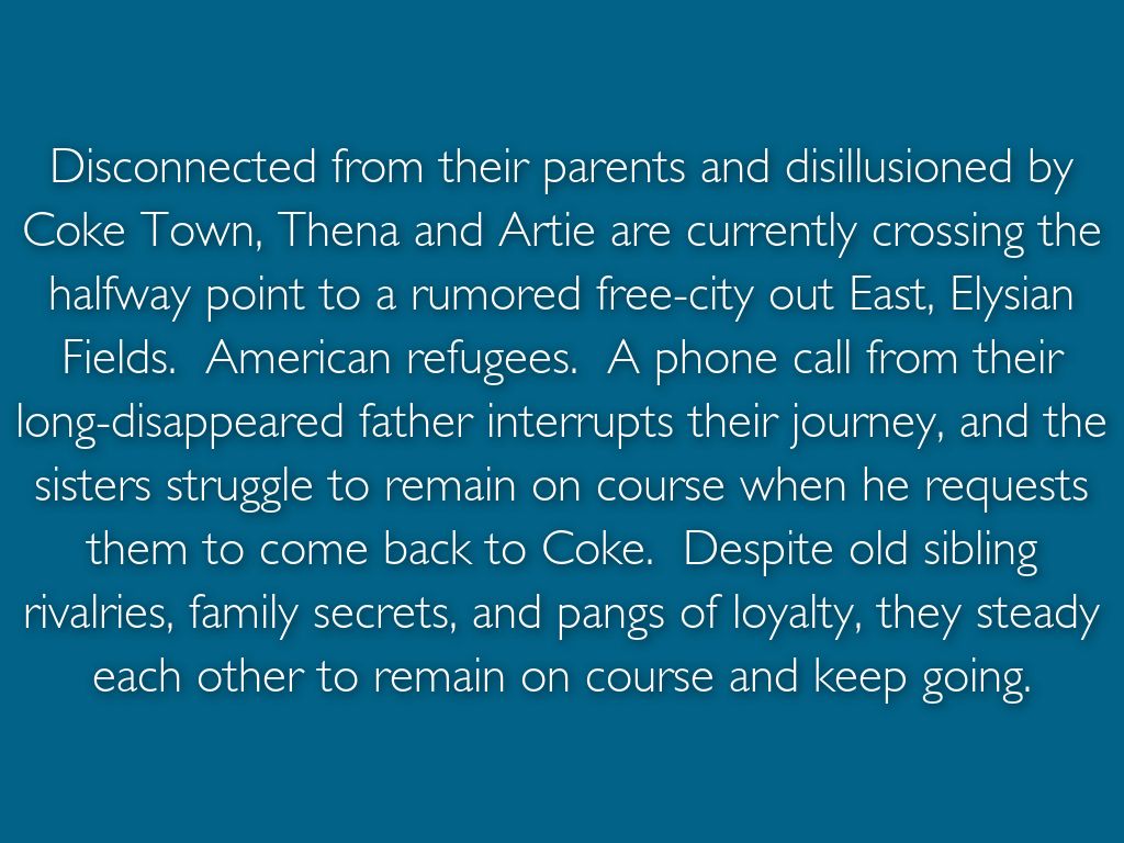 Disconnected from their parents and disillusioned by Coke Town, Thena and Artie are currently crossing the halfway point to a rumored free-city out East, Elysian Fields. American refugees. A phone call from their long-disappeared father interrupts their journey, and the sisters struggle to remain on course when he requests them to come back to Coke. Despite old sibling rivalries, family secrets, and pangs of loyalty, they steady each other to remain on course and keep going.