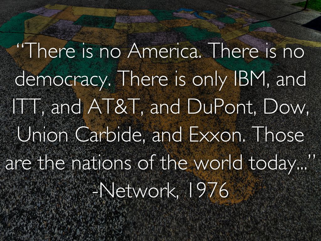 “There is no America. There is no democracy. There is only IBM, and ITT, and AT&T, and DuPont, Dow, Union Carbide, and Exxon. Those are the nations of the world today...”
