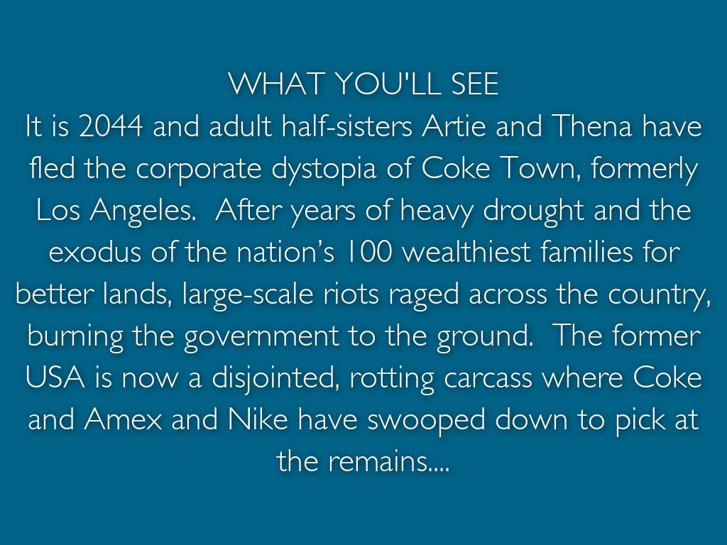 It is 2044 and adult half-sisters Artie and Thena have fled the corporate dystopia of Coke Town, formerly Los Angeles. After years of heavy drought and the exodus of the nation’s 100 wealthiest families for better lands, large-scale riots raged across the country, burning the government to the ground. The former USA is now a disjointed, rotting carcass where Coke and Amex and Nike have swooped down to pick at the remains....