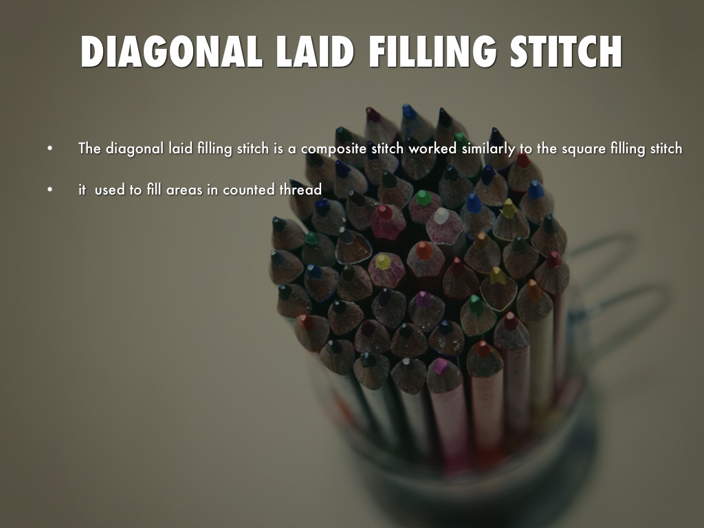 The diagonal laid filling stitch is a composite stitch worked similarly to the square filling stitch
