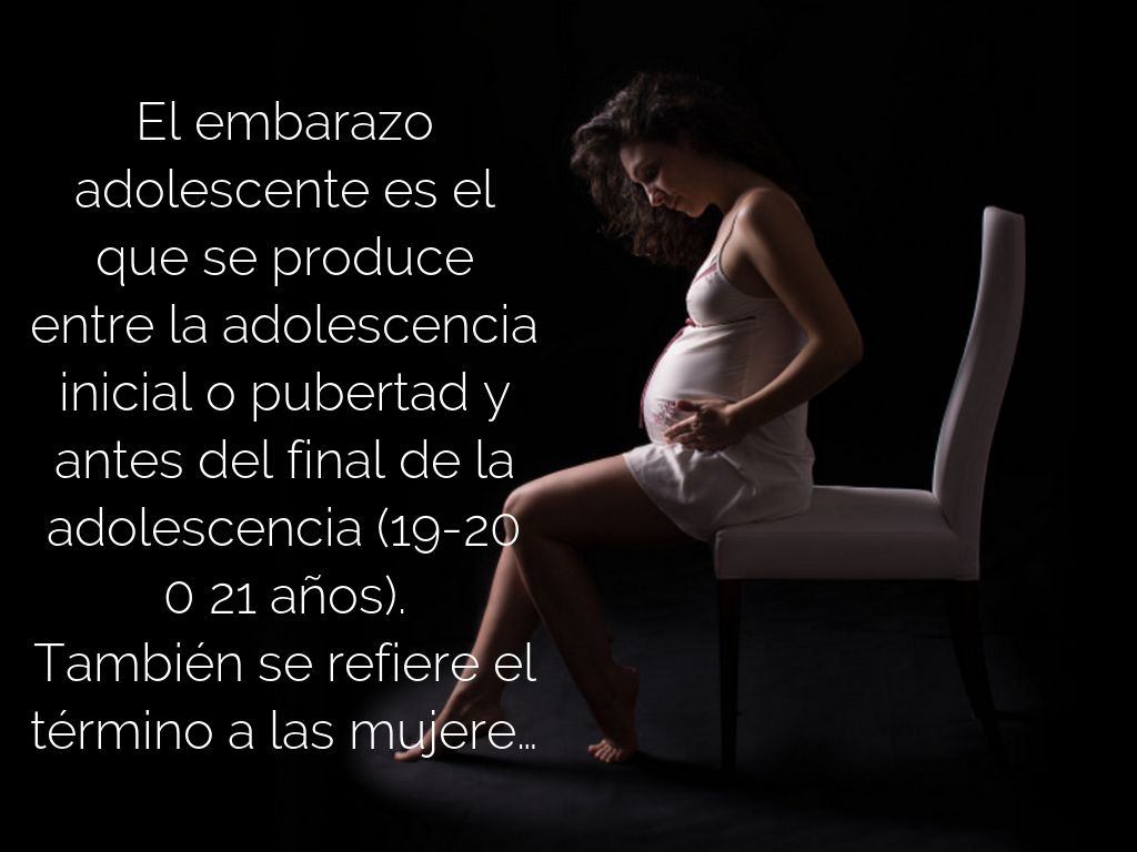 El embarazo adolescente es el que se produce entre la adolescencia inicial o pubertad y antes del final de la adolescencia (19-20 0 21 años).