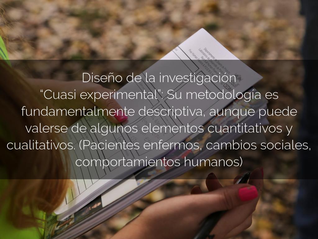 “Cuasi experimental”: Su metodología es fundamentalmente descriptiva, aunque puede valerse de algunos elementos cuantitativos y cualitativos. (Pacientes enfermos, cambios sociales, comportamientos humanos)