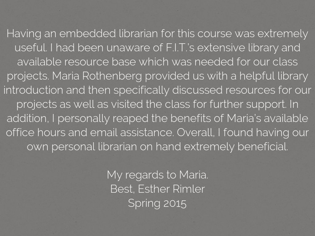 Having an embedded librarian for this course was extremely useful. I had been unaware of F.I.T.’s extensive library and available resource base which was needed for our class projects. Maria Rothenberg provided us with a helpful library introduction and then specifically discussed resources for our projects as well as visited the class for further support. In addition, I personally reaped the benefits of Maria’s available office hours and email assistance. Overall, I found having our own personal librarian on hand extremely beneficial.