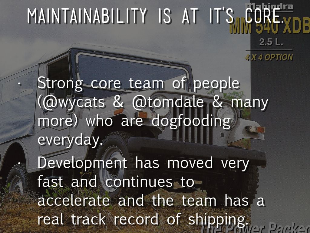 It is backed by google which means they are serious about javascript and Angular 2.0 will probably be pretty nice. However, being that it's development cycle is unknown and the developers have no problem killing support for things. It does feel like maintainability is questionable.