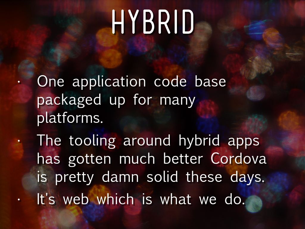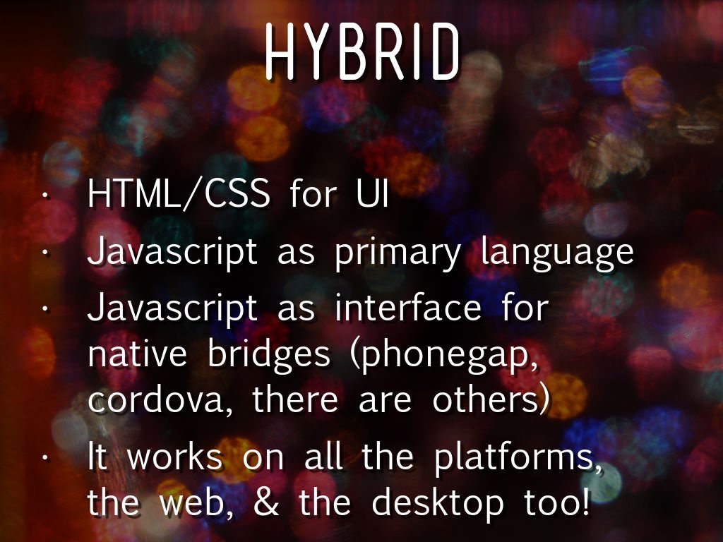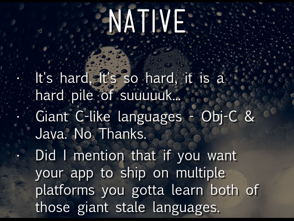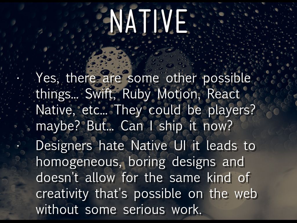 Yes, there are some other possible things... Swift, Ruby Motion, React Native, etc... They could be players? maybe? But... Can I ship it now?