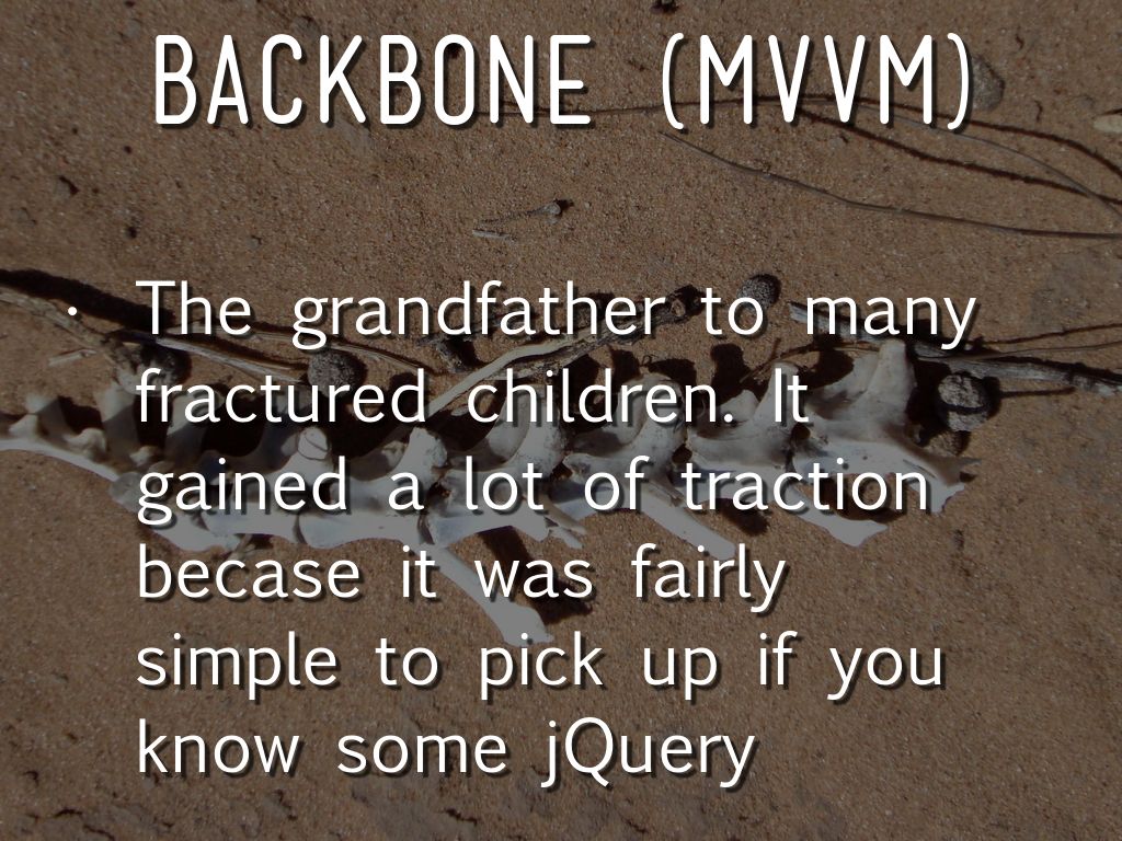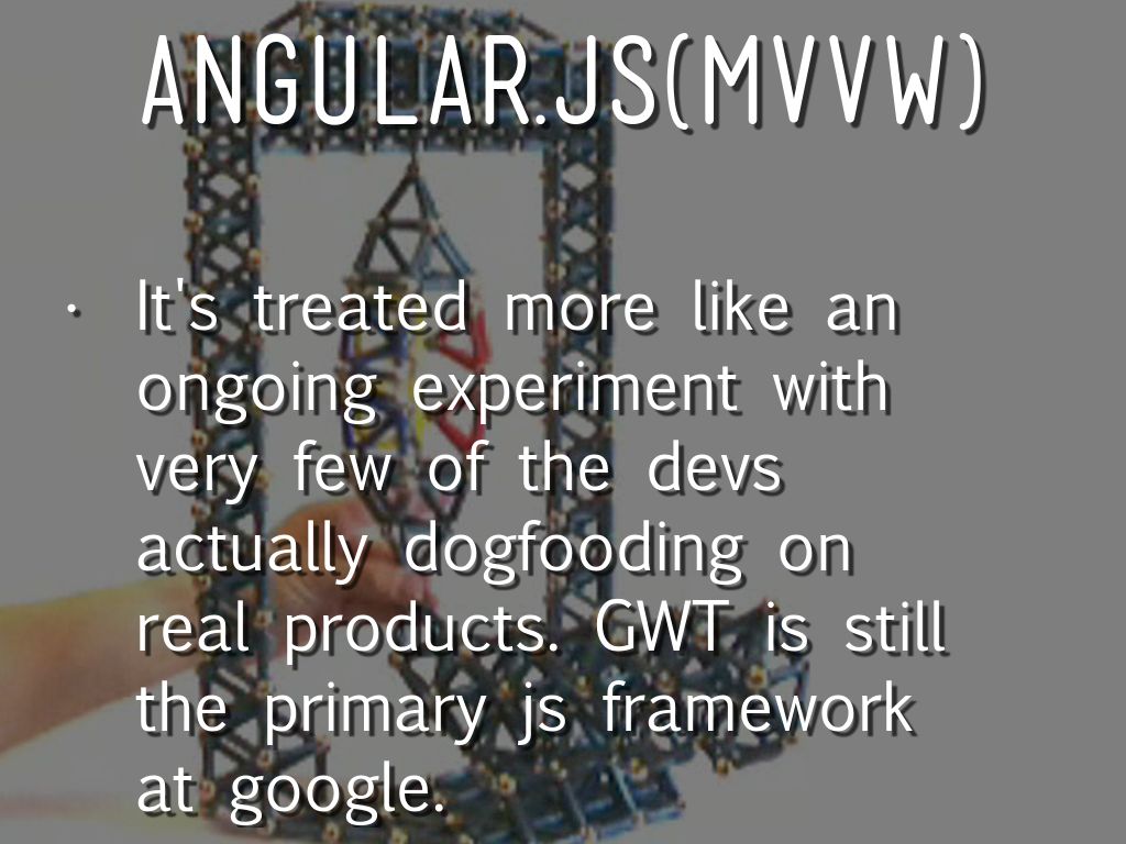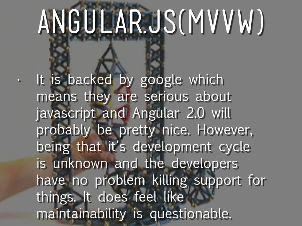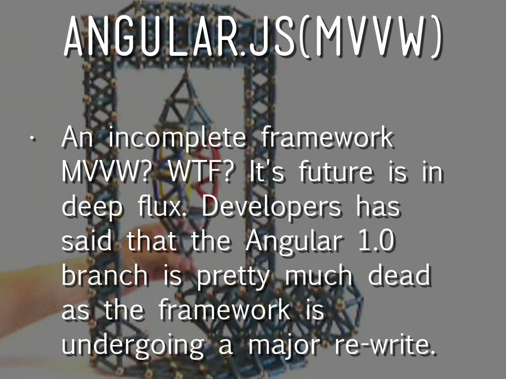 An incomplete framework MVVW? WTF? It's future is in deep flux. Developers has said that the Angular 1.0 branch is pretty much dead as the framework is undergoing a major re-write.