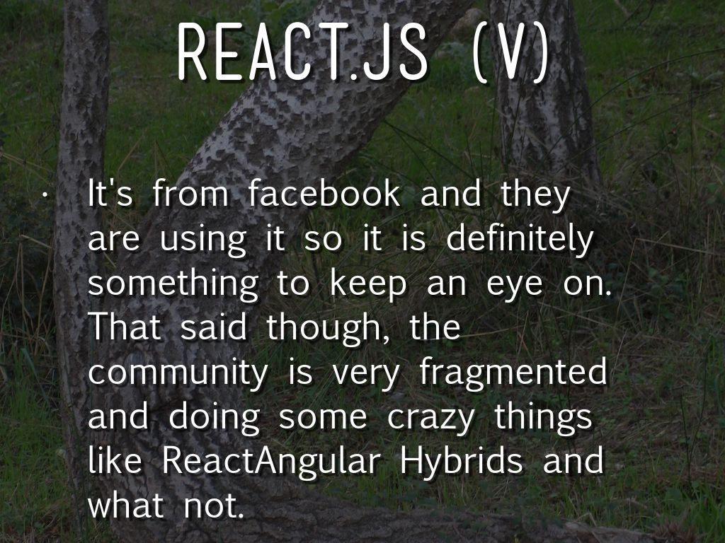 It's from facebook and they are using it so it is definitely something to keep an eye on. That said though, the community is very fragmented and doing some crazy things like ReactAngular Hybrids and what not.