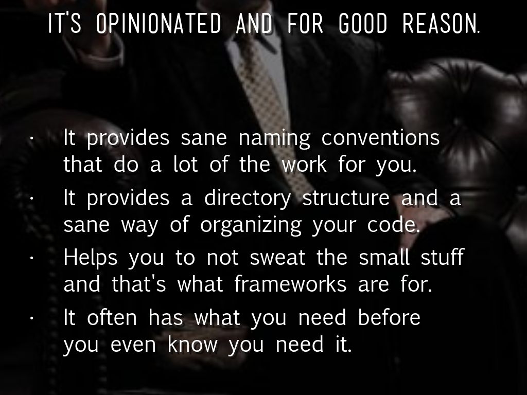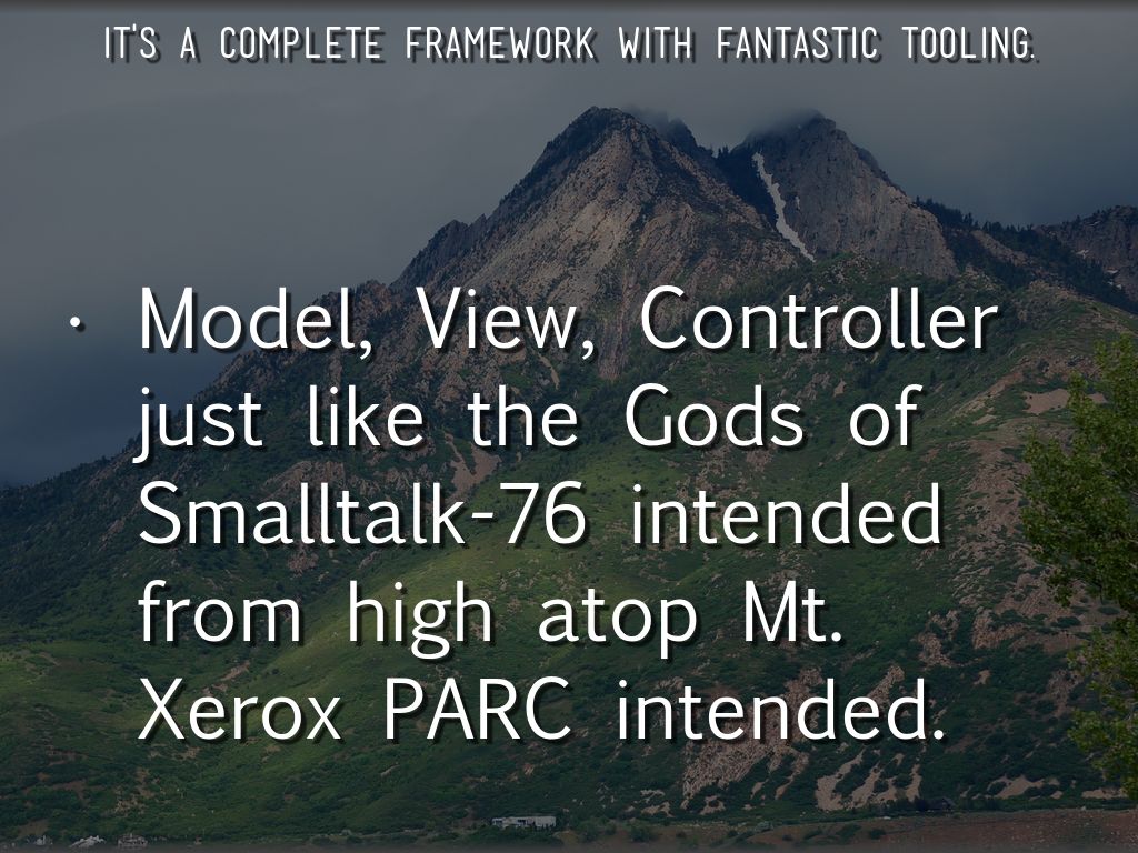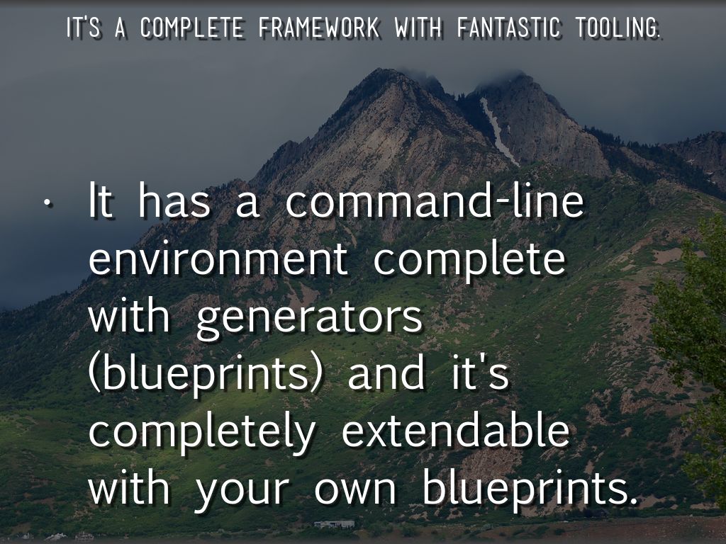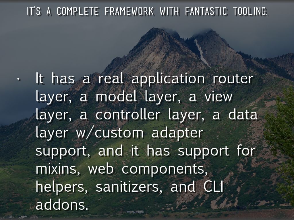 It has a real application router layer, a model layer, a view layer, a controller layer, a data layer w/custom adapter support, and it has support for mixins, web components, helpers, sanitizers, and CLI addons.
