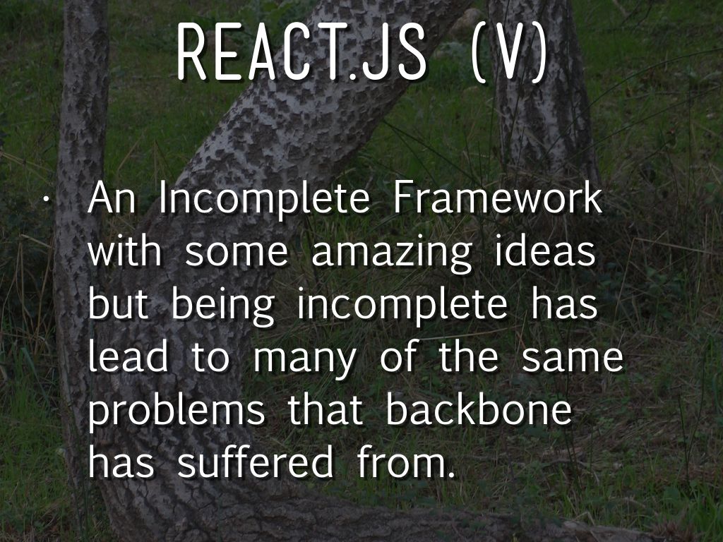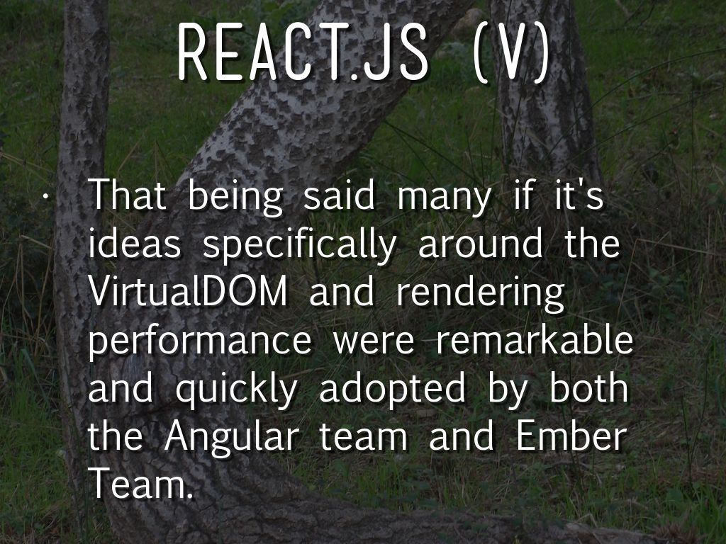 That being said many if it's ideas specifically around the VirtualDOM and rendering performance were remarkable and quickly adopted by both the Angular team and Ember Team.