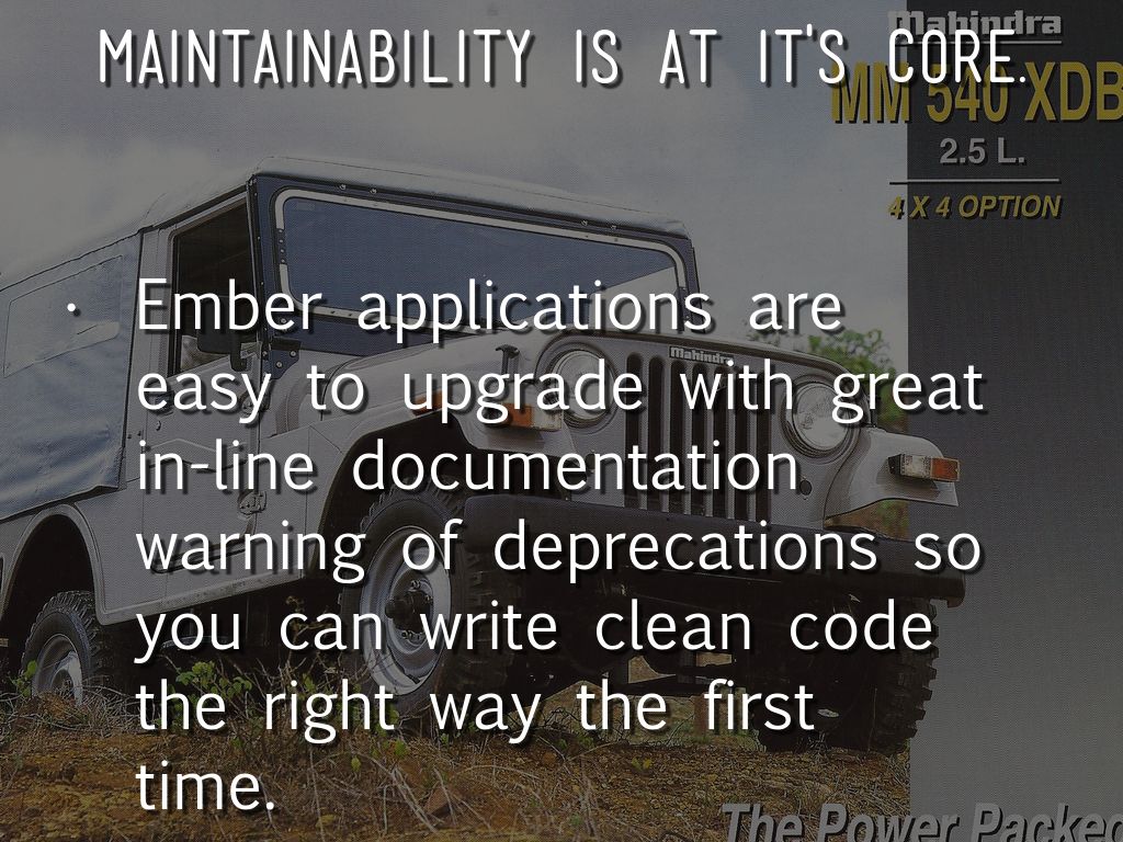 Ember applications are easy to upgrade with great in-line documentation warning of deprecations so you can write clean code the right way the first time.