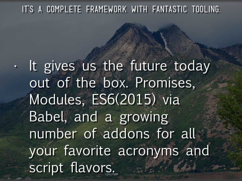 It gives us the future today out of the box. Promises, Modules, ES6(2015) via Babel, and a growing number of addons for all your favorite acronyms and script flavors.