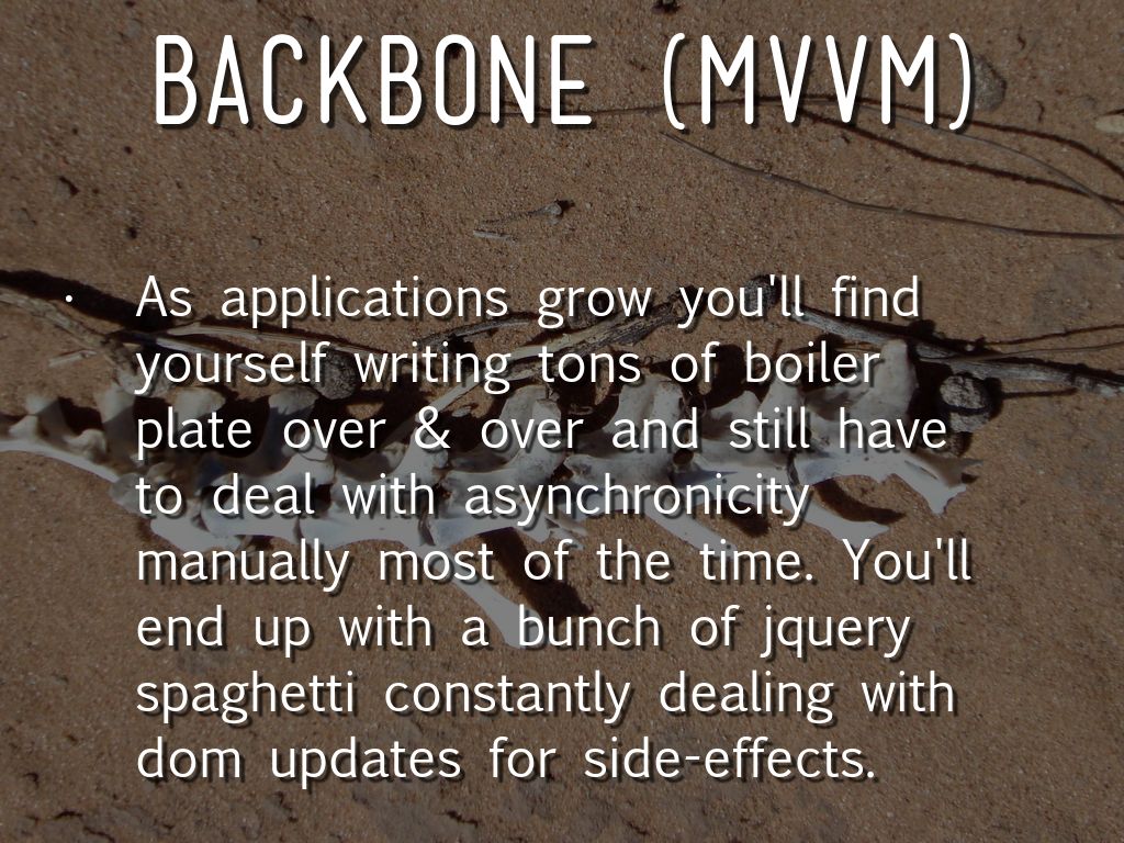 As applications grow you'll find yourself writing tons of boiler plate over & over and still have to deal with asynchronicity manually most of the time. You'll end up with a bunch of jquery spaghetti constantly dealing with dom updates for side-effects.