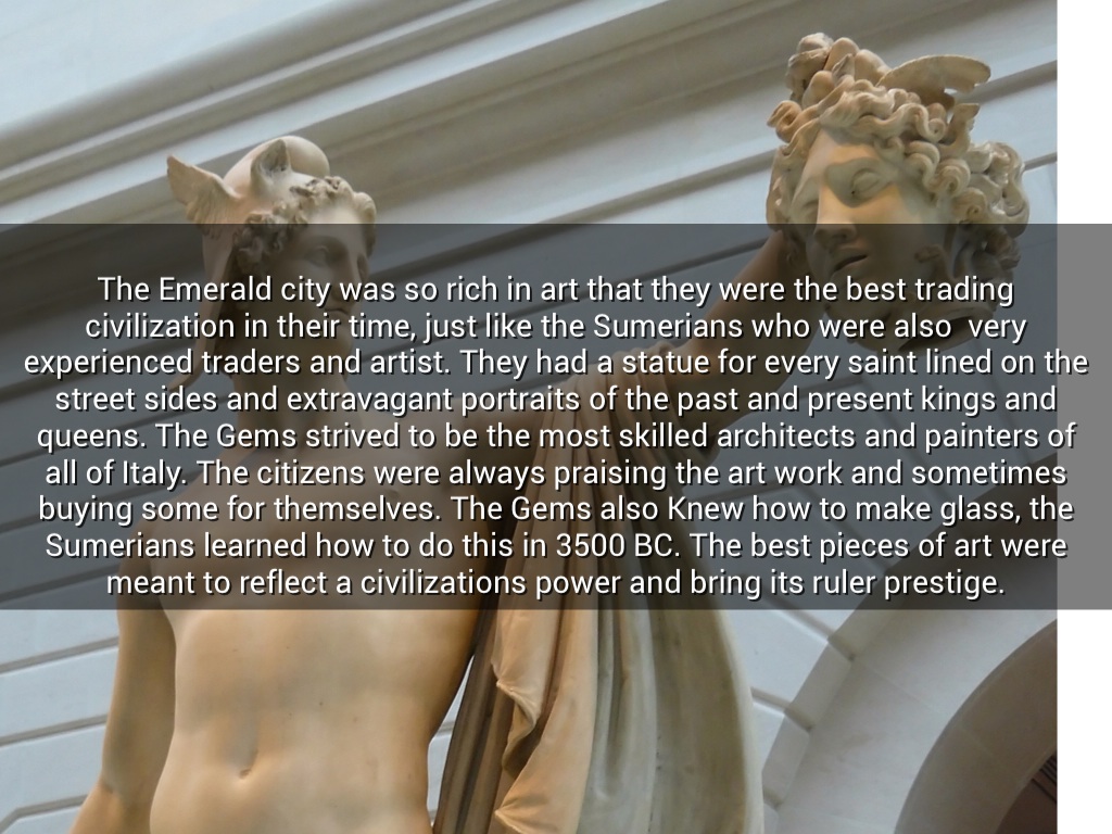 The Emerald city was so rich in art that they were the best trading civilization in their time, just like the Sumerians who were also very experienced traders and artist. They had a statue for every saint lined on the street sides and extravagant portraits of the past and present kings and queens. The Gems strived to be the most skilled architects and painters of all of Italy. The citizens were always praising the art work and sometimes buying some for themselves. The Gems also Knew how to make glass, the Sumerians learned how to do this in 3500 BC. The best pieces of art were meant to reflect a civilizations power and bring its ruler prestige.