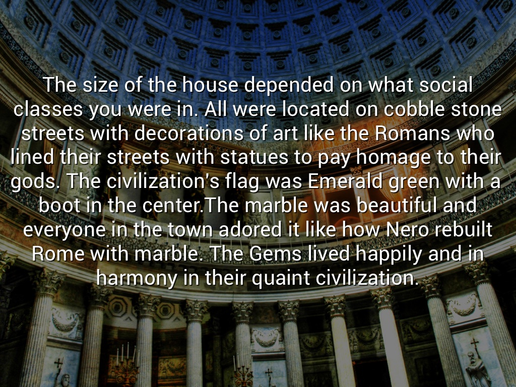 The size of the house depended on what social classes you were in. All were located on cobble stone streets with decorations of art like the Romans who lined their streets with statues to pay homage to their gods. The civilization's flag was Emerald green with a boot in the center.The marble was beautiful and everyone in the town adored it like how Nero rebuilt Rome with marble. The Gems lived happily and in harmony in their quaint civilization.