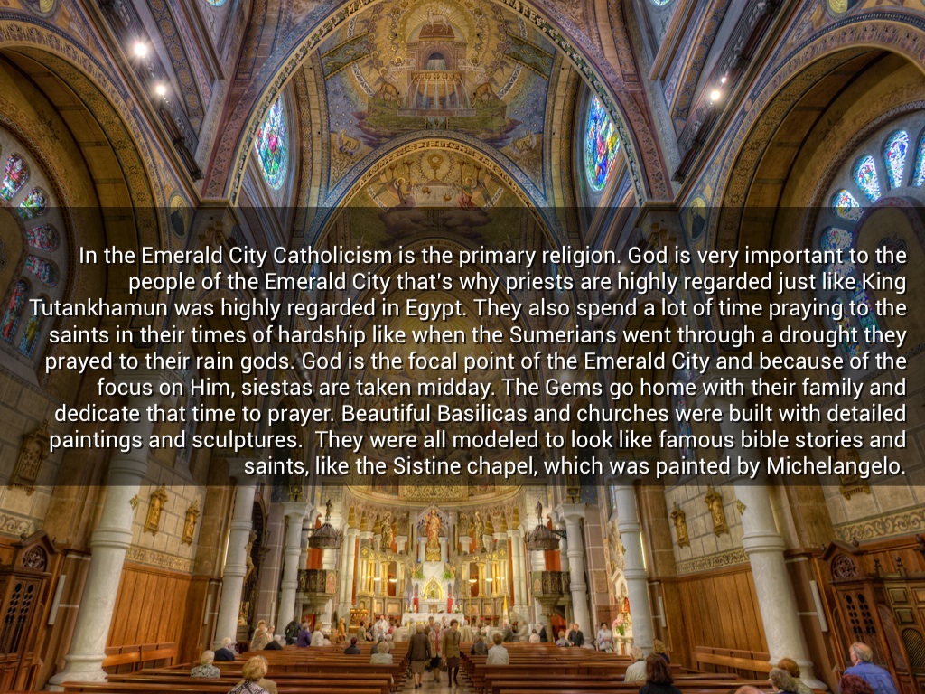In the Emerald City Catholicism is the primary religion. God is very important to the people of the Emerald City that’s why priests are highly regarded just like King Tutankhamun was highly regarded in Egypt. They also spend a lot of time praying to the saints in their times of hardship like when the Sumerians went through a drought they prayed to their rain gods. God is the focal point of the Emerald City and because of the focus on Him, siestas are taken midday. The Gems go home with their family and dedicate that time to prayer. Beautiful Basilicas and churches were built with detailed paintings and sculptures. They were all modeled to look like famous bible stories and saints, like the Sistine chapel, which was painted by Michelangelo.