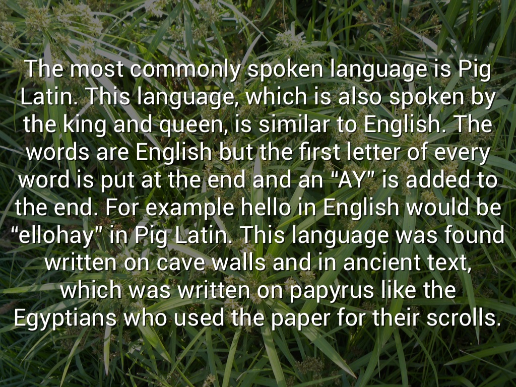 The most commonly spoken language is Pig Latin. This language, which is also spoken by the king and queen, is similar to English. The words are English but the first letter of every word is put at the end and an “AY” is added to the end. For example hello in English would be “ellohay” in Pig Latin. This language was found written on cave walls and in ancient text, which was written on papyrus like the Egyptians who used the paper for their scrolls.