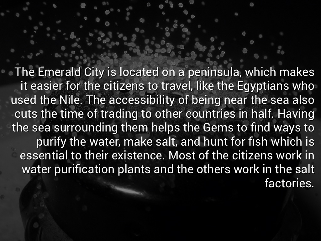 The Emerald City is located on a peninsula, which makes it easier for the citizens to travel, like the Egyptians who used the Nile. The accessibility of being near the sea also cuts the time of trading to other countries in half. Having the sea surrounding them helps the Gems to find ways to purify the water, make salt, and hunt for fish which is essential to their existence. Most of the citizens work in water purification plants and the others work in the salt factories.