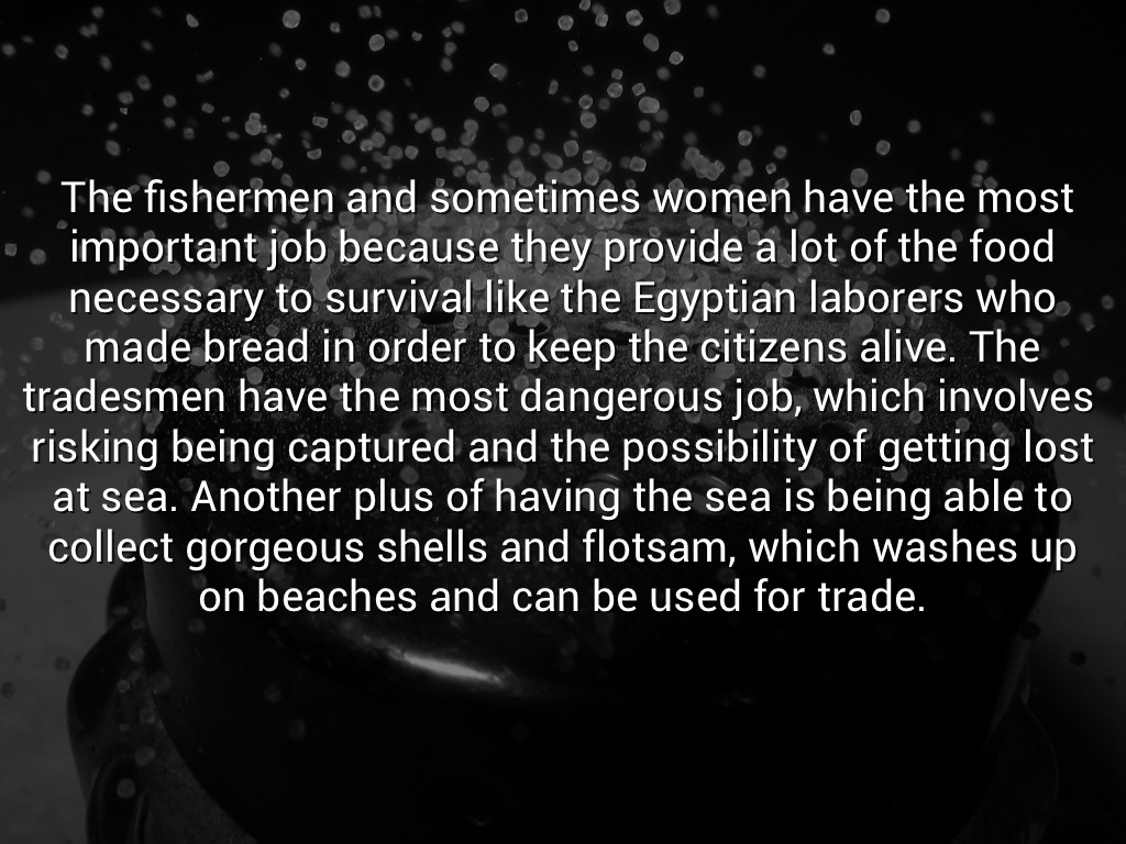 The fishermen and sometimes women have the most important job because they provide a lot of the food necessary to survival like the Egyptian laborers who made bread in order to keep the citizens alive. The tradesmen have the most dangerous job, which involves risking being captured and the possibility of getting lost at sea. Another plus of having the sea is being able to collect gorgeous shells and flotsam, which washes up on beaches and can be used for trade.