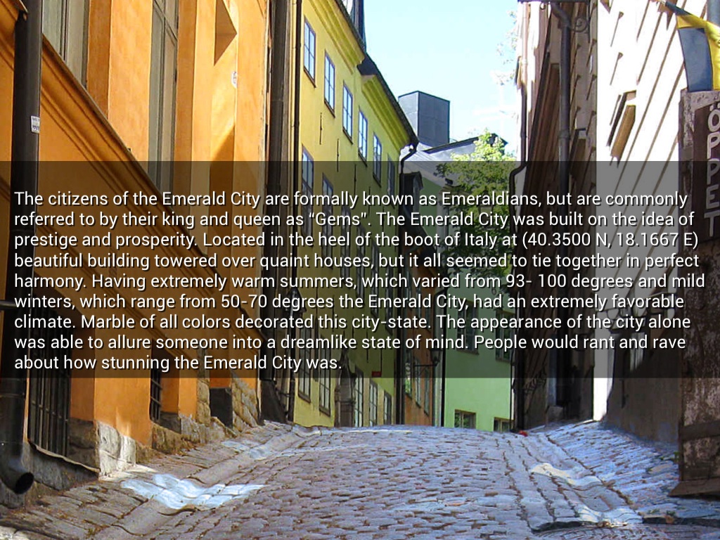 The citizens of the Emerald City are formally known as Emeraldians, but are commonly referred to by their king and queen as “Gems”. The Emerald City was built on the idea of prestige and prosperity. Located in the heel of the boot of Italy at (40.3500 N, 18.1667 E) beautiful building towered over quaint houses, but it all seemed to tie together in perfect harmony. Having extremely warm summers, which varied from 93- 100 degrees and mild winters, which range from 50-70 degrees the Emerald City, had an extremely favorable climate. Marble of all colors decorated this city-state. The appearance of the city alone was able to allure someone into a dreamlike state of mind. People would rant and rave about how stunning the Emerald City was.