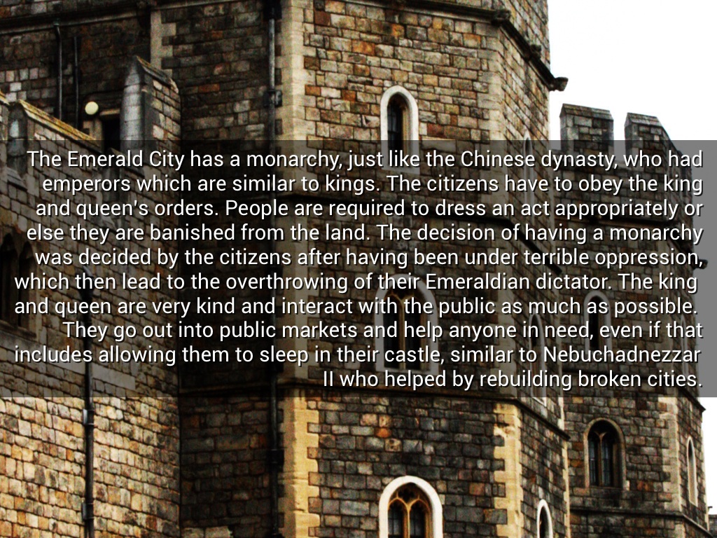 The Emerald City has a monarchy, just like the Chinese dynasty, who had emperors which are similar to kings. The citizens have to obey the king and queen’s orders. People are required to dress an act appropriately or else they are banished from the land. The decision of having a monarchy was decided by the citizens after having been under terrible oppression, which then lead to the overthrowing of their Emeraldian dictator. The king and queen are very kind and interact with the public as much as possible. They go out into public markets and help anyone in need, even if that includes allowing them to sleep in their castle, similar to Nebuchadnezzar II who helped by rebuilding broken cities.