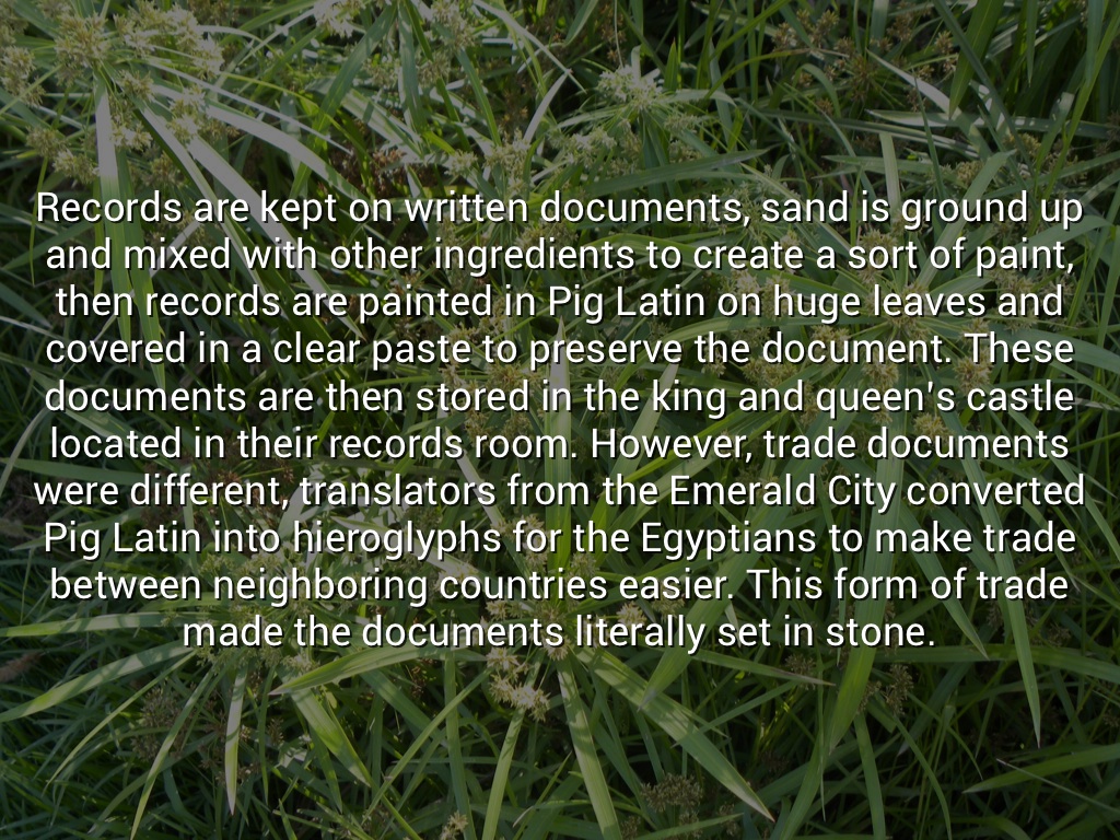 Records are kept on written documents, sand is ground up and mixed with other ingredients to create a sort of paint, then records are painted in Pig Latin on huge leaves and covered in a clear paste to preserve the document. These documents are then stored in the king and queen’s castle located in their records room. However, trade documents were different, translators from the Emerald City converted Pig Latin into hieroglyphs for the Egyptians to make trade between neighboring countries easier. This form of trade made the documents literally set in stone.
