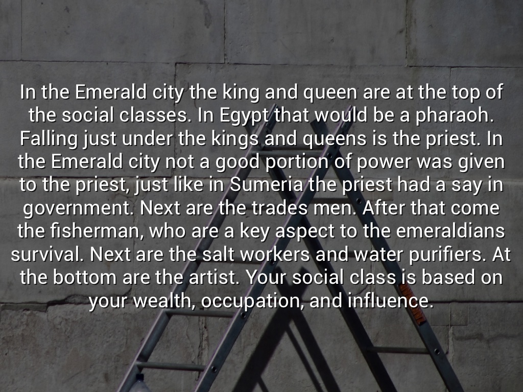 In the Emerald city the king and queen are at the top of the social classes. In Egypt that would be a pharaoh. Falling just under the kings and queens is the priest. In the Emerald city not a good portion of power was given to the priest, just like in Sumeria the priest had a say in government. Next are the trades men. After that come the fisherman, who are a key aspect to the emeraldians survival. Next are the salt workers and water purifiers. At the bottom are the artist. Your social class is based on your wealth, occupation, and influence.