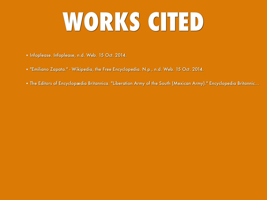 The Editors of Encyclopædia Britannica. "Liberation Army of the South (Mexican Army)." Encyclopedia Britannica Online. Encyclopedia Britannica, n.d. Web. 15 Oct. 2014. What are n.p. & n.d.? | Copy & Paste View in list Edit