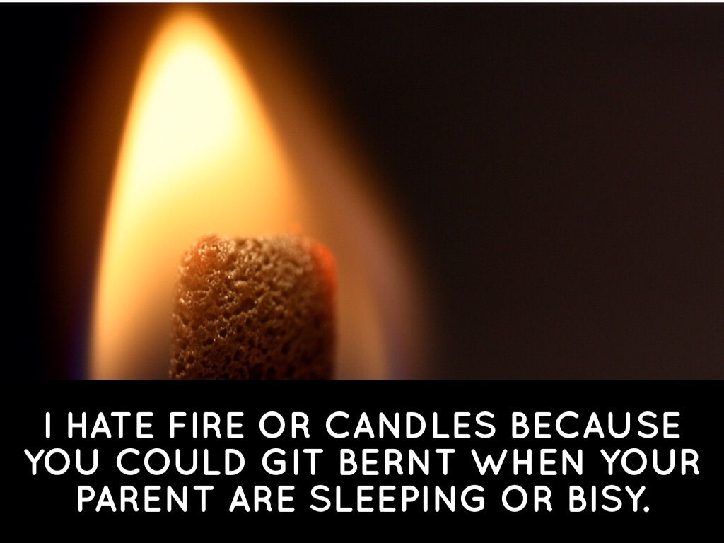 I HATE FIRE OR CANDLES BECAUSE YOU COULD GIT BERNT WHEN YOUR PARENT ARE SLEEPING OR BISY.