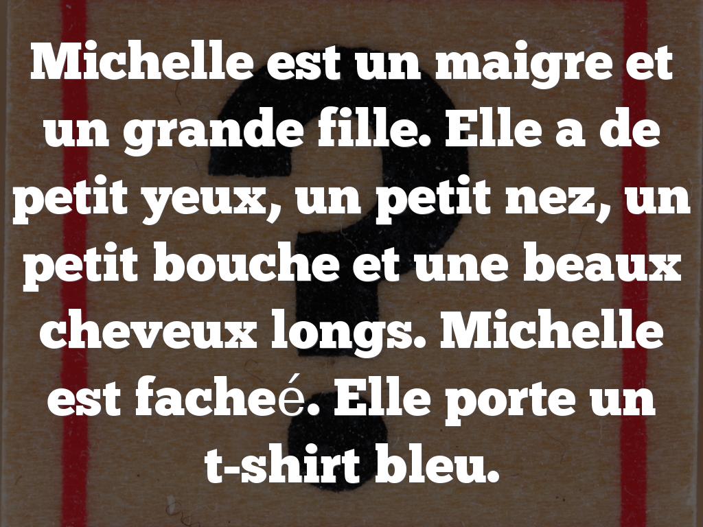 Michelle est un maigre et un grande fille. Elle a de petit yeux, un petit nez, un petit bouche et une beaux cheveux longs. Michelle est facheé. Elle porte un t-shirt bleu.