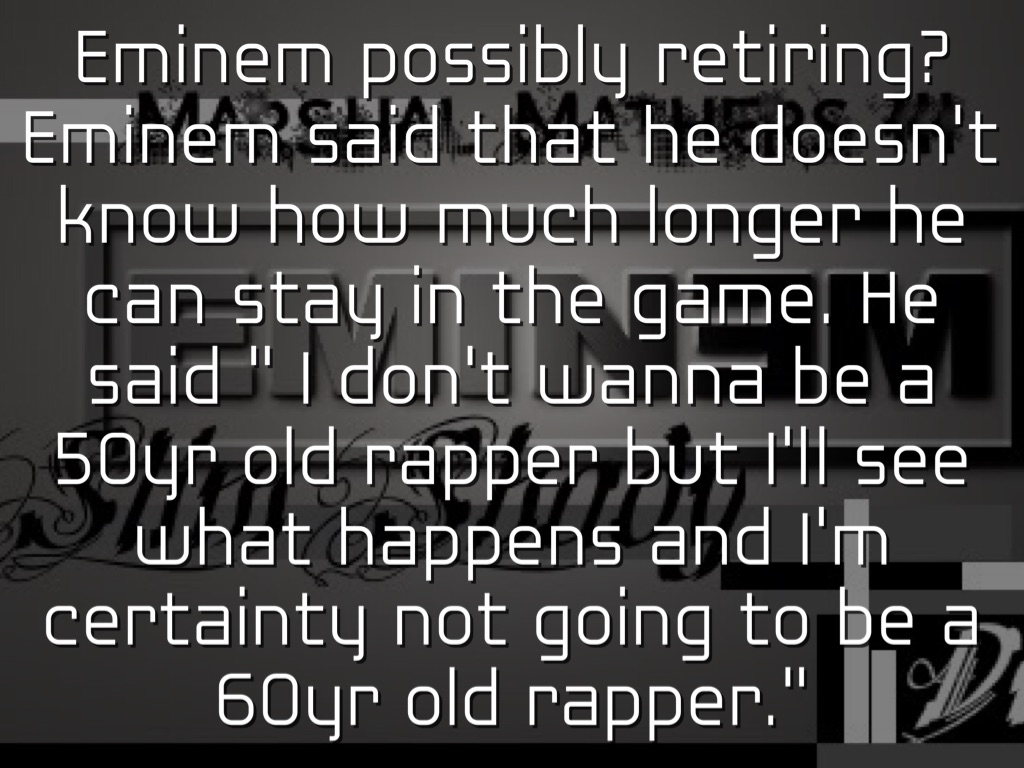 Eminem said that he doesn't know how much longer he can stay in the game. He said " I don't wanna be a 50yr old rapper but I'll see what happens and I'm certainty not going to be a 60yr old rapper."